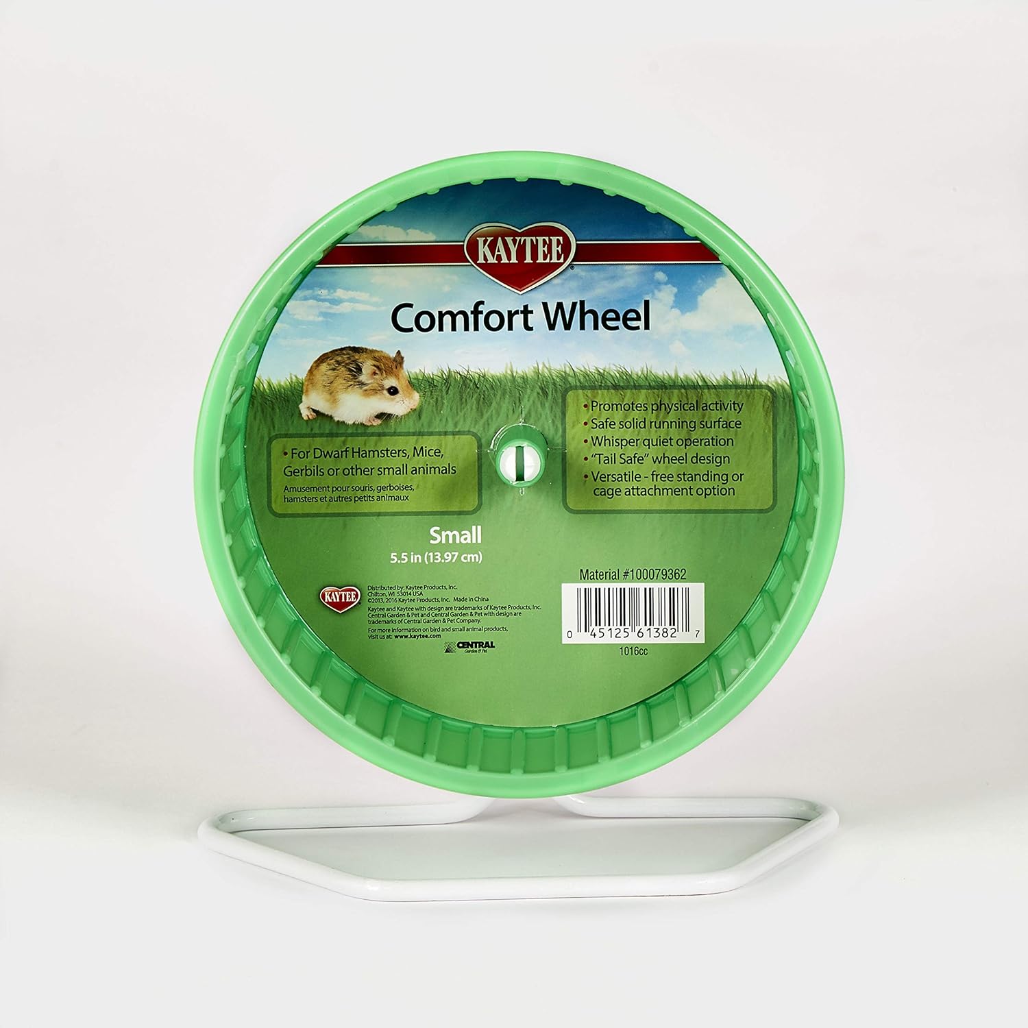 The Kaytee comfort wheel features a safe, solid running surface, quiet operation and a "tail-safe" Design, allowing pets Easy entrance and exit. Every comfort wheel comes with a heavy duty wire stand and a 2-way attachment clip, so the wheel can be used either free-standing or clipped to a wire cage. Available in sizes small, large or giant. Colors vary.