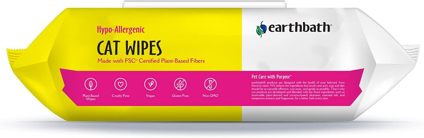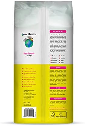 Earthbath® Hypo-Allergenic Cat Wipes safely and easily wipe away dander, dirt, and residual saliva from your finely furred friend's coat. Dander & saliva build-up are the leading causes of human/cat allergies, and use of these wipes can help resolve this issue in short order, while leaving your cat or kitten softer, shinier, & smelling better than ever before. Mild cleansers deodorize, freshen & clean as the exotic Hawaiian awapuhi conditions the coat and imparts a healthy shine. Aloe vera and vitamin E moisturize both coat and skin. Safe for daily use on cats and kittens over 6 weeks old. For sensitive skin/allergy & multi-cat households Wipes away dirt & dander Neutralizes odors Made with  FSC® Certified plant-based fibers These cat wipes are also included in our Hypo-Allergenic Cat Grooming Set .