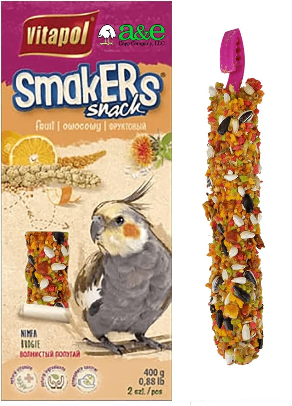Brand A&E Cage Co. Flavor Apple Item Form Stick Special Ingredients Millet grain, wheat, seed mixture, dried...