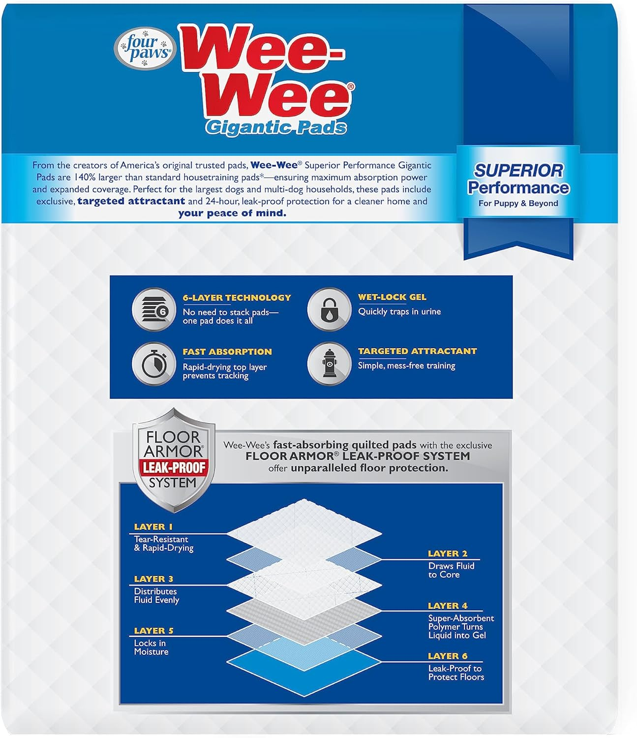 Four Paws Wee-Wee Superior Performance Gigantic Pee Pads for Extra Large Dogs, Leak-Proof Floor Protection Dog & Puppy Quilted Potty Training Pads, Unscented