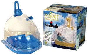 Watch your pet bird splish and splash with the JW® Insight® Bird Bath. An easy way to support your pet birds natural bathing habits. Provides your bird a convenient spot to the bath as it is designed to easily fit on the main door of most small and medium cages with a clever screw-on design. The brightly colored base and a clear cover allow you to easily watch your bird splish, splash and bathe. Constructed of a safe, non-toxic plastic with a unique rubber rim to help keep the bath water in and keep your bird's cage cleaner. A great way to promote your birds health and cut down on feather dust. Ideal for parakeets, cockatiels and smaller birds, fits small and medium cages. Not for use with round or curved wall cages.