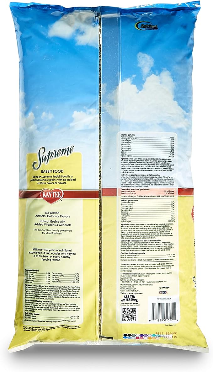 Kaytee Supreme Rabbit food is a wholesome, high-quality mix that contains all of the natural protein, fiber, oils and nutrients of whole grains. Fortified to ensure a balance blend, Supreme utilizes natural seeds, grains and pellets to provide your small pet with a simple yet healthy diet. Kaytee Supreme offers high quality ingredients small animals love and the nutrition they require. Kaytee understands that sharing your life with a small pet is not only enjoyable but very enriching. Kaytee shows our love by ensuring we provide your small pet with the best nutrition for a long and healthy life. With over 150 years of nutritional experience, it's no wonder why Kaytee is at the heart of every healthy feeding routine. A naturally preserved product needs special attention to maintain maximum freshness. After opening bag, remove air from package and reseal tightly. Use food within 30 - 45 days. Store in a cool, dry location. Refrigerate or freeze for extended storage.