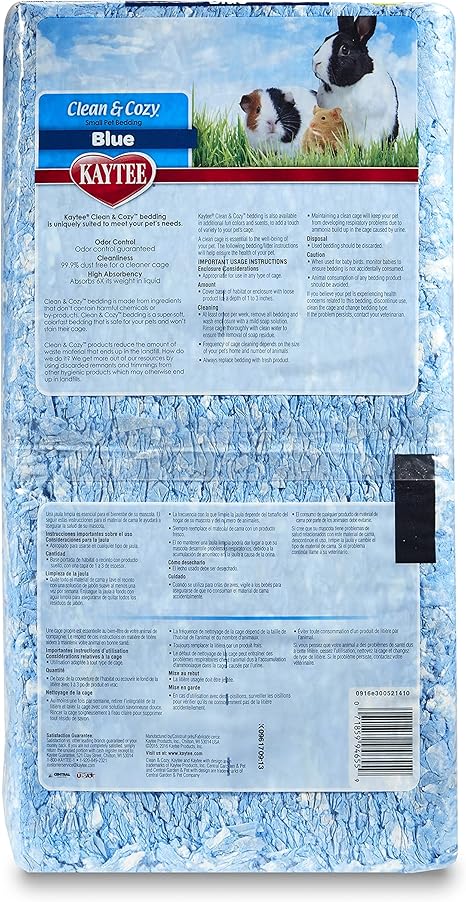 Kaytee Clean & Cozy Blue small pet paper bedding gives you a whole new standard in super-soft, absorbent bedding. Clean & Cozy is soft and fluffy to encourage burrowing or nesting while absorbing two times more liquid than wood shavings. Clean & Cozy's absorbency means less odor. That's why Clean & Cozy has an odor control guarantee. Plus Clean & Cozy is 99% dust free for a cleaner cage. Clean & Cozy Blue bedding is a great way to add some color to your pets home.