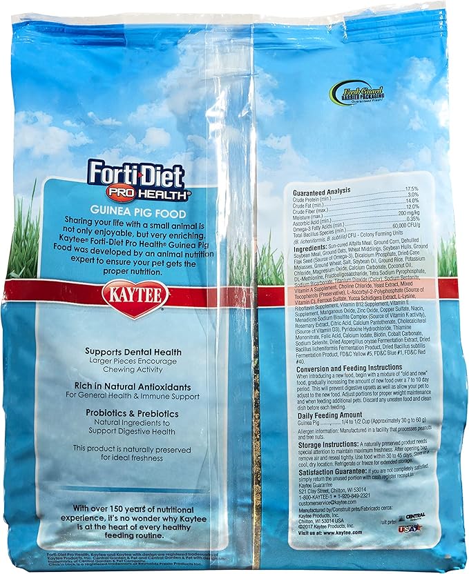 Kaytee Forti-Diet Pro Health Guinea Pig food was developed by an animal nutritional expert to ensure your pet gets the proper nutrition. Forti-Diet Pro Health contains probiotics and prebiotics to support digestive health. This food is rich in natural antioxidants for general health and immune support plus contains some larger, more crunchy pieces to support dental health through natural chewing activity. Kaytee understands that sharing your life with a small pet is not only enjoyable but very enriching. Kaytee shows our love by ensuring we provide your small pet with the best nutrition for a long and healthy life. With over 150 years of nutritional experience, it's no wonder why Kaytee is at the heart of every healthy feeding routine. A naturally preserved product needs special attention to maintain maximum freshness. After opening bag, remove air from package and reseal tightly. Use food within 30 - 45 days. Store in a cool, dry location. Refrigerate or freeze for extended storage.