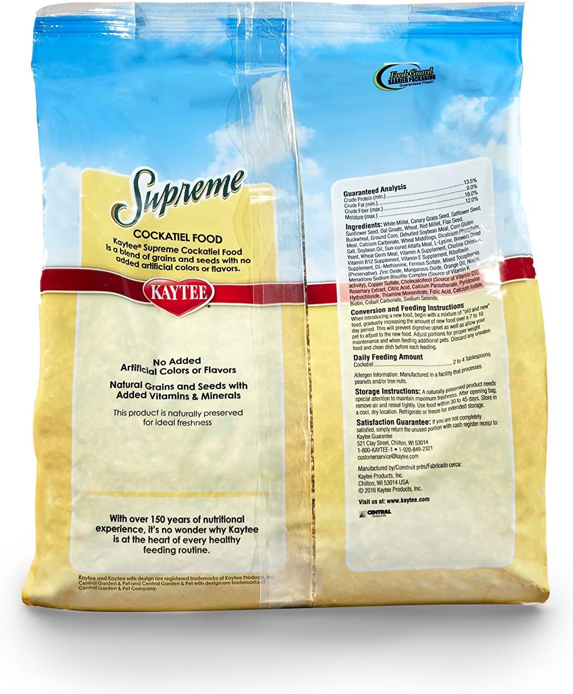 Kaytee Supreme Cockatiel food is a wholesome, high-quality mix that contains all of the natural protein, fiber, oils and nutrients of whole grains. Fortified to ensure a balance blend, Supreme utilizes natural seeds, grains and pellets to provide your bird with a simple yet healthy diet. Kaytee Supreme offers high quality ingredients pet birds love and the nutrition they require. Kaytee understands that sharing your life with a pet bird is not only enjoyable but very enriching. Kaytee shows our love by ensuring we provide your pet bird with the best nutrition for a long and healthy life. With over 150 years of nutritional experience, it's no wonder why Kaytee is at the heart of every healthy feeding routine. A naturally preserved product needs special attention to maintain maximum freshness. After opening bag, remove air from package and reseal tightly. Use food within 30 - 45 days. Store in a cool, dry location. Refrigerate or freeze for extended storage.