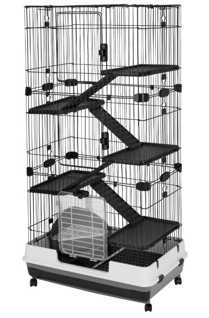 Featuring five plastic shelves with connecting ramps, it creates six levels of fun and activity to keep your pet entertained. The cage includes large swing-out doors for easy access, a drop-down door ramp for convenient entry, and removable plastic trays for effortless cleaning. Its deep base helps contain litter, ensuring a tidy and hygienic setup.