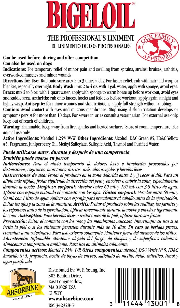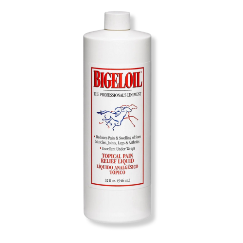 Born on the race track, Bigeloil® Liniment is an invigorating liquid rub that quickly stimulates circulation to help relieve sore muscles, tendons, and joints. Bigeloil® features a pleasant scent and a more moderate sensation than our Absorbine® Veterinary Liniment. 16 oz. or 32 oz. bottles.