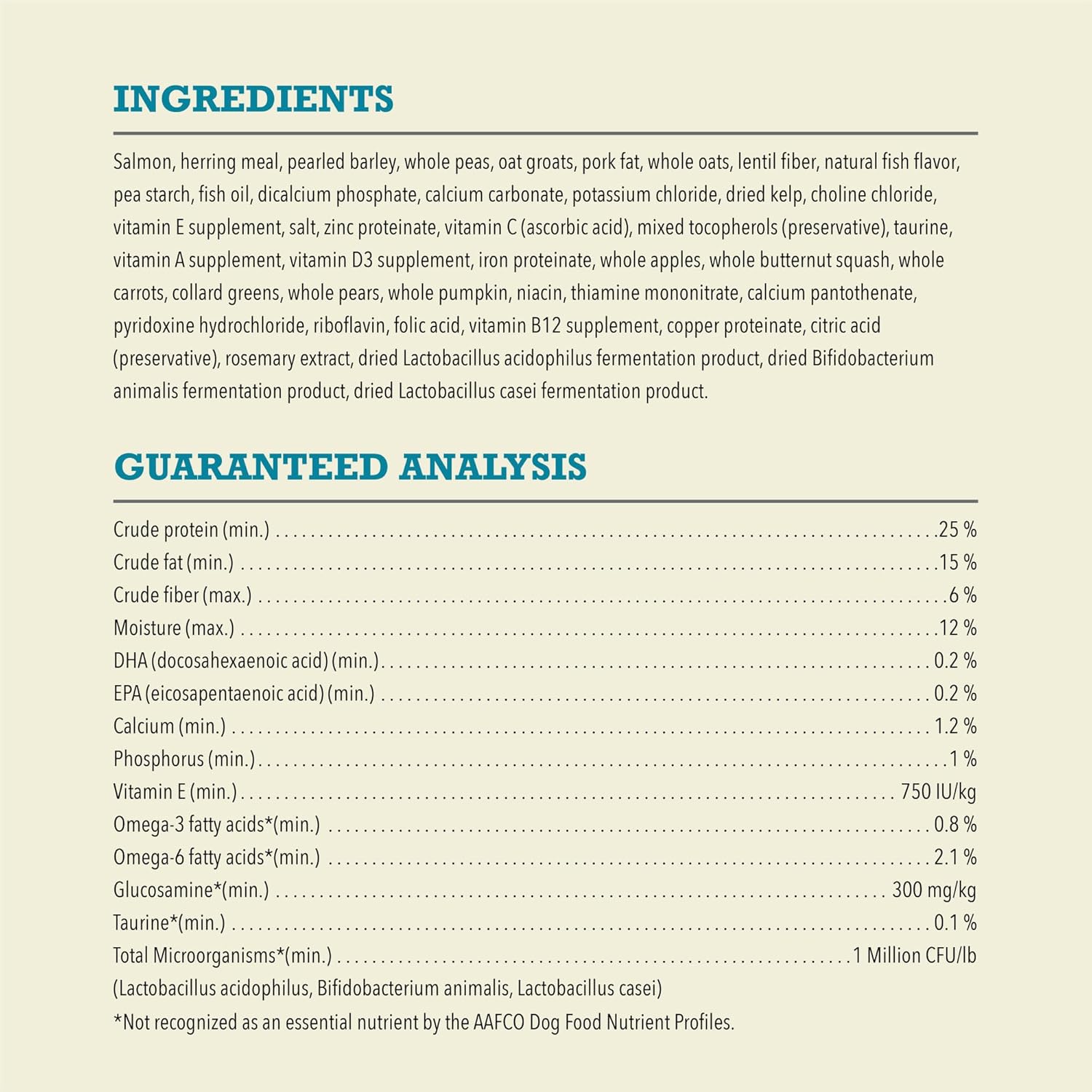 Salmon, herring meal, pearled barley, whole peas, oat groats, pork fat, whole oats, lentil fiber, natural fish flavor, pea starch, fish oil, dicalcium phosphate, calcium carbonate, potassium chloride, dried kelp, choline chloride, vitamin E supplement, salt, zinc proteinate, vitamin C (ascorbic acid), mixed tocopherols (preservative), taurine, vitamin A supplement, vitamin D3 supplement, iron proteinate, whole apples, whole butternut squash, whole carrots, collard greens, whole pears, whole pumpkin, niacin, thiamine mononitrate, calcium pantothenate, pyridoxine hydrochloride, riboflavin, folic acid, vitamin B12 supplement, copper proteinate, citric acid (preservative), rosemary extract, dried Lactobacillus acidophilus fermentation product, dried Bifidobacterium animalis fermentation product, dried Lactobacillus casei fermentation product.