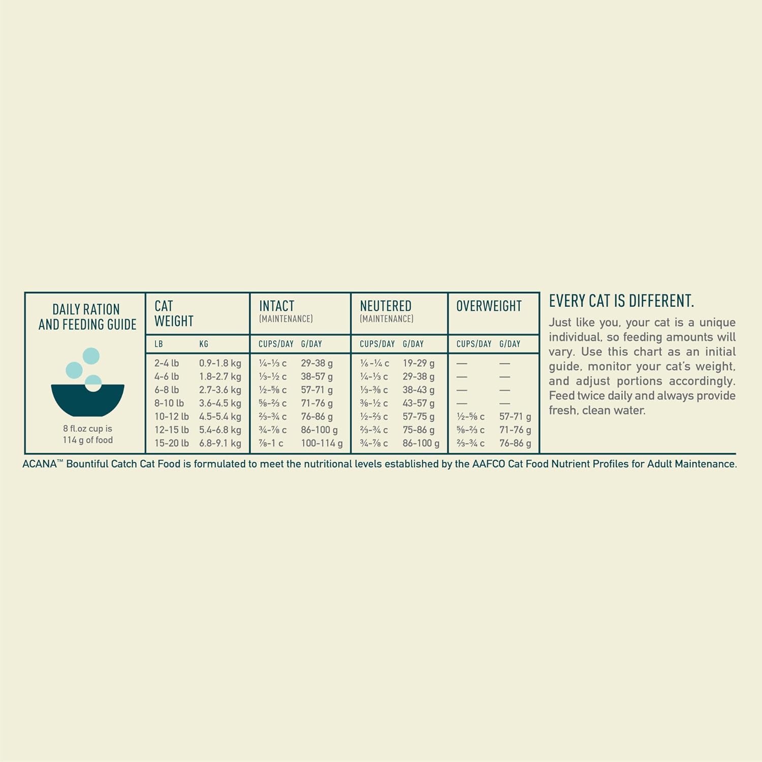 Brand ACANA Flavor Bountiful Catch Age Range (Description) All Life Stages Item Form cat food Specific Uses...