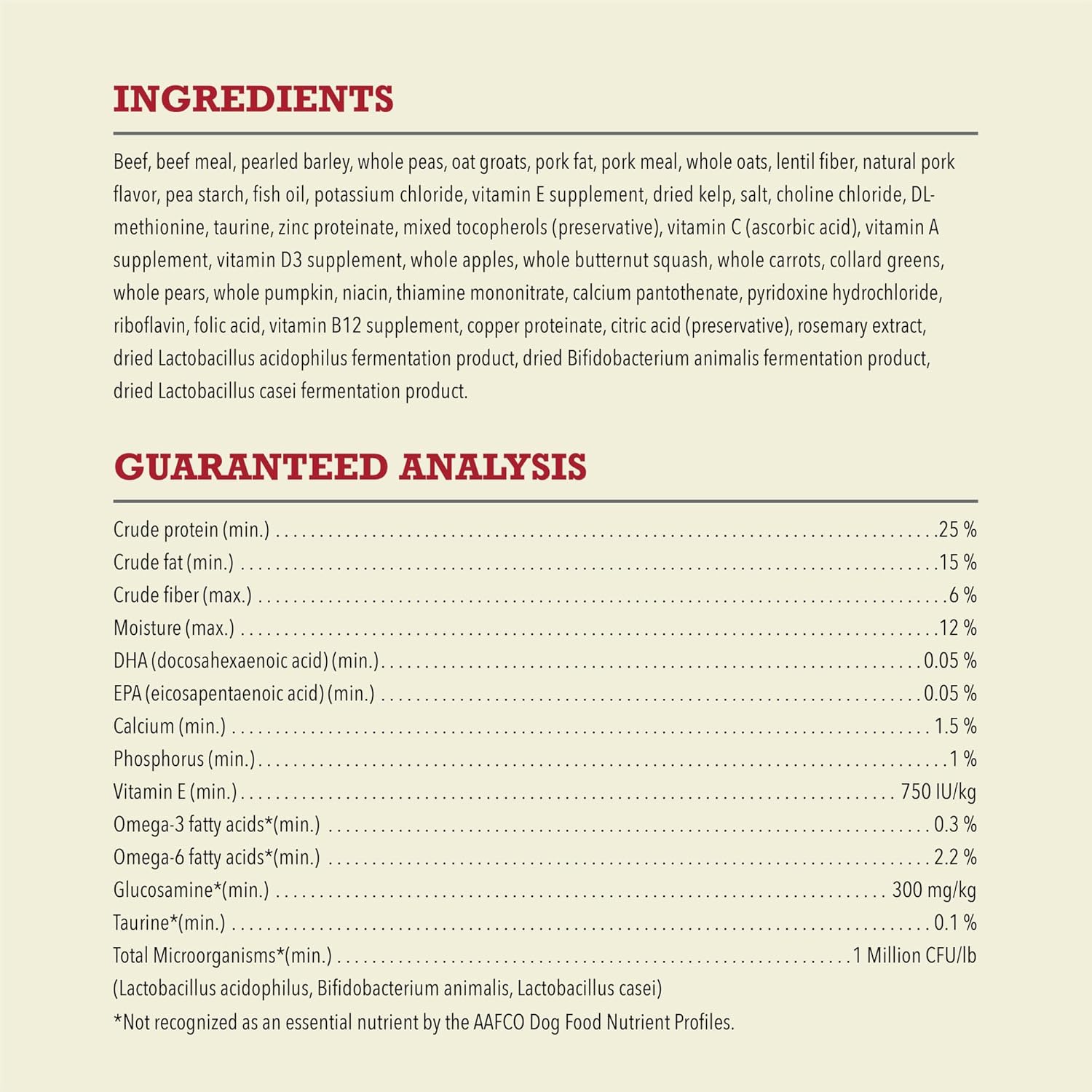 Beef, beef meal, pearled barley, whole peas, oat groats, pork fat, pork meal, whole oats, lentil fiber, natural pork flavor, pea starch, fish oil, potassium chloride, vitamin E supplement, dried kelp, salt, choline chloride, DL-methionine, taurine, zinc proteinate, mixed tocopherols (preservative), vitamin C (ascorbic acid), vitamin A supplement, vitamin D3 supplement, whole apples, whole butternut squash, whole carrots, collard greens, whole pears, whole pumpkin, niacin, thiamine mononitrate, calcium pantothenate, pyridoxine hydrochloride, riboflavin, folic acid, vitamin B12 supplement, copper proteinate, citric acid (preservative), rosemary extract, dried Lactobacillus acidophilus fermentation product, dried Bifidobacterium animalis fermentation product, dried Lactobacillus casei fermentation product.