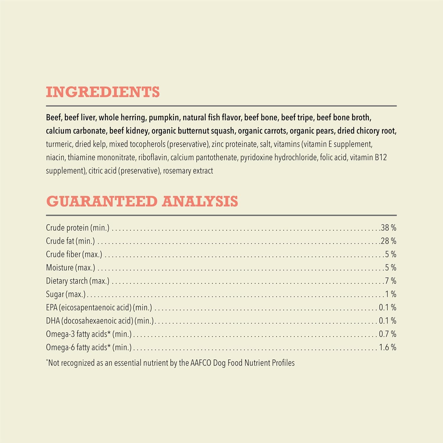 Beef, beef liver, whole mackerel, pumpkin, natural fish flavor, beef bone, beef tripe, beef kidney, beef bone broth, organic butternut squash, organic carrots, organic pear, salt, dried chicory root, turmeric, dried kelp, mixed tocopherols (preservative), zinc proteinate, vitamins (vitamin E supplement, niacin, thiamine mononitrate, riboflavin, calcium pantothenate, pyridoxine hydrochloride, folic acid, vitamin B12 supplement), citric acid (preservative), rosemary extract