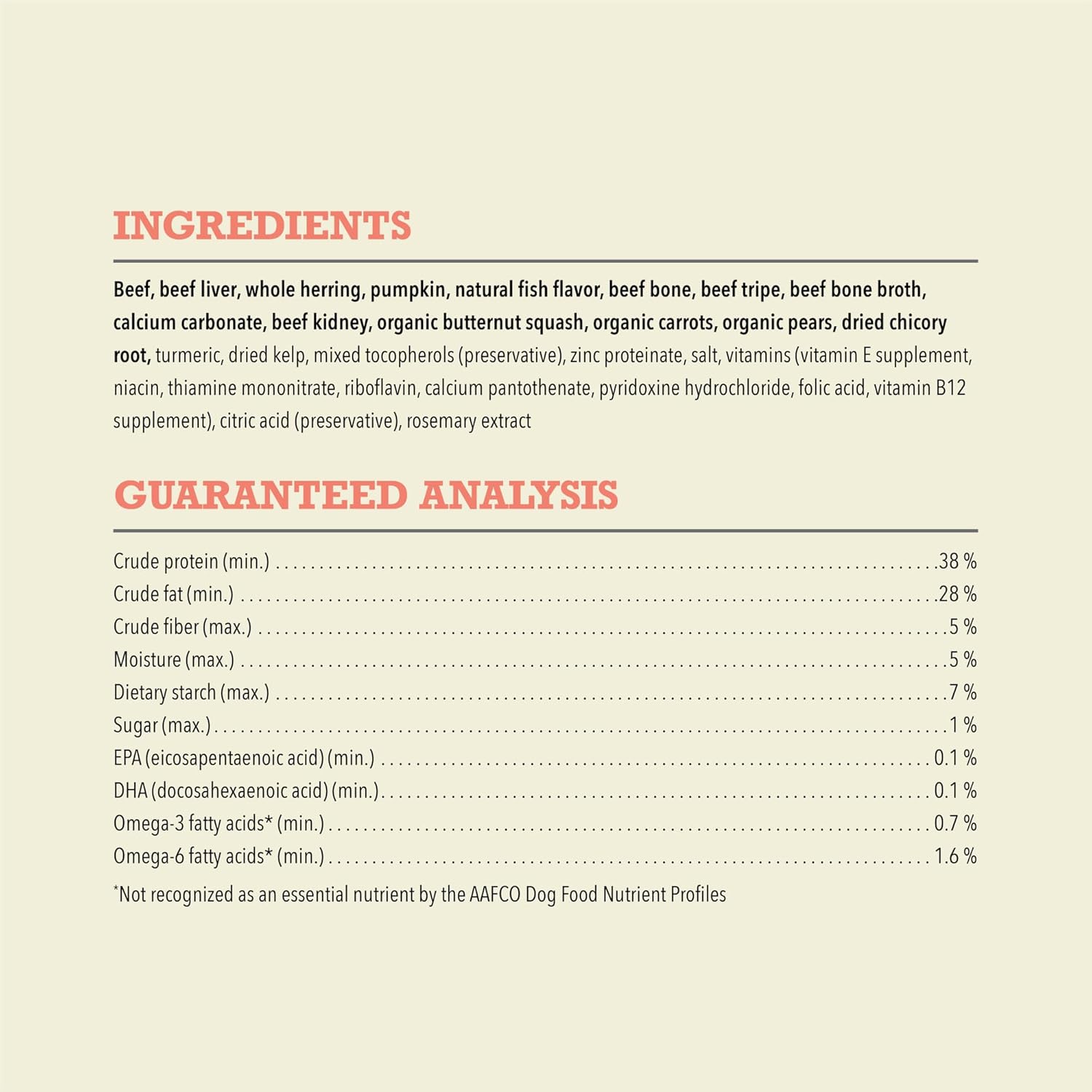 Beef, beef liver, whole mackerel, pumpkin, natural fish flavor, beef bone, beef tripe, beef kidney, beef bone broth, organic butternut squash, organic carrots, organic pear, salt, dried chicory root, turmeric, dried kelp, mixed tocopherols (preservative), zinc proteinate, vitamins (vitamin E supplement, niacin, thiamine mononitrate, riboflavin, calcium pantothenate, pyridoxine hydrochloride, folic acid, vitamin B12 supplement), citric acid (preservative), rosemary extract