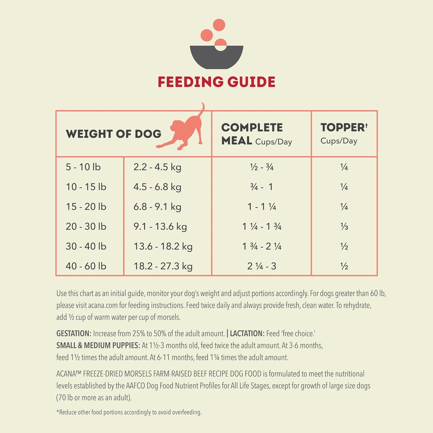 - One (1) 8 oz bag of ACANA High Protein Farm-Raised Beef Recipe Freeze Dried Dog Food Meal & Topper