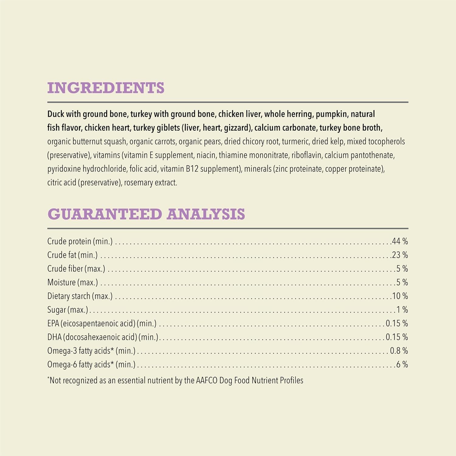 Duck with ground bone, turkey with ground bone, chicken liver, whole herring, pumpkin, natural fish flavor, chicken heart, turkey liver, turkey bone broth, organic butternut squash, organic carrots, organic pear, salt, dried chicory root, turmeric, dried kelp, mixed tocopherols (preservative), vitamins (vitamin E supplement, niacin, thiamine mononitrate, riboflavin, calcium pantothenate, pyridoxine hydrochloride, folic acid, vitamin B12 supplement), minerals (zinc proteinate, copper proteinate), citric acid (preservative), rosemary extract