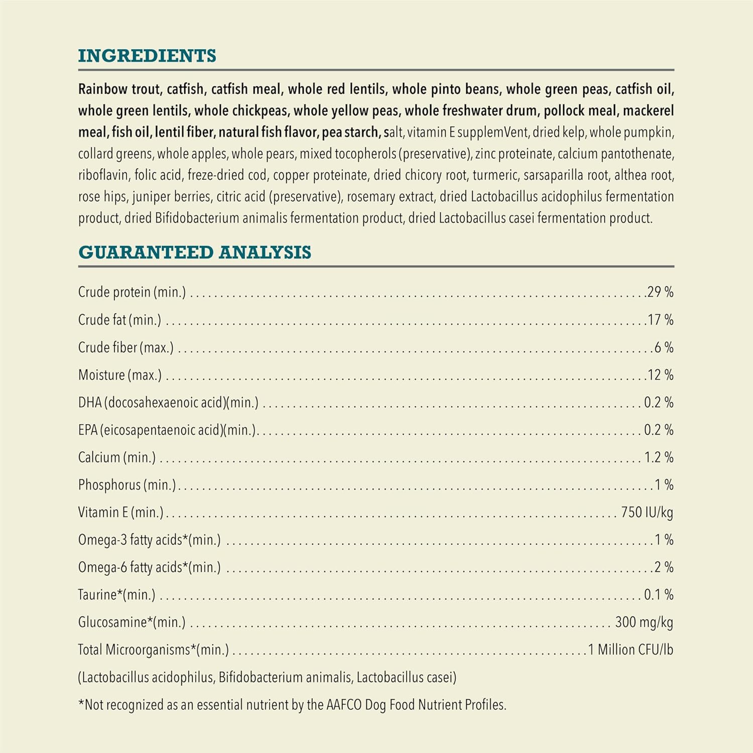 Rainbow trout, catfish, catfish meal, whole red lentils, whole pinto beans, whole green peas, catfish oil, whole green lentils, whole chickpeas, whole yellow peas, whole perch, whitefish meal, fish oil, mackerel meal, lentil fiber, Natural fish flavor, pea starch, salt, dried kelp, whole pumpkin, collard greens, whole apples, whole pears, mixed tocopherols (preservative), zinc proteinate, vitamin E supplement, calcium pantothenate, riboflavin, folic acid, freeze_x0002_dried cod liver, copper proteinate, dried chicory root, turmeric, sarsaparilla, althea root, rose hips, juniper berries, citric acid (preservative), rosemary extract, dried Lactobacillus acidophilus fermentation product, dried Bifidobacterium animalis fermentation product, dried Lactobacillus casei fermentation product.