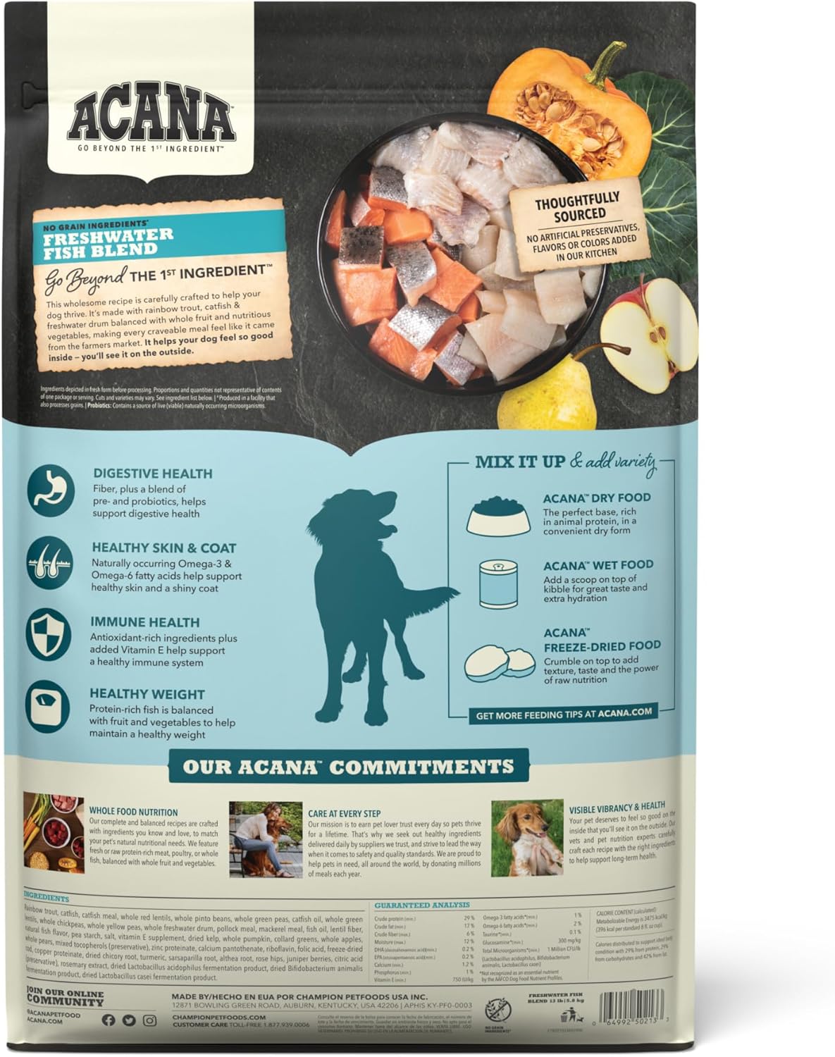 - One (1) 13 lb bag of ACANA Grain Free* Freshwater Fish Recipe Dry Dog Food
