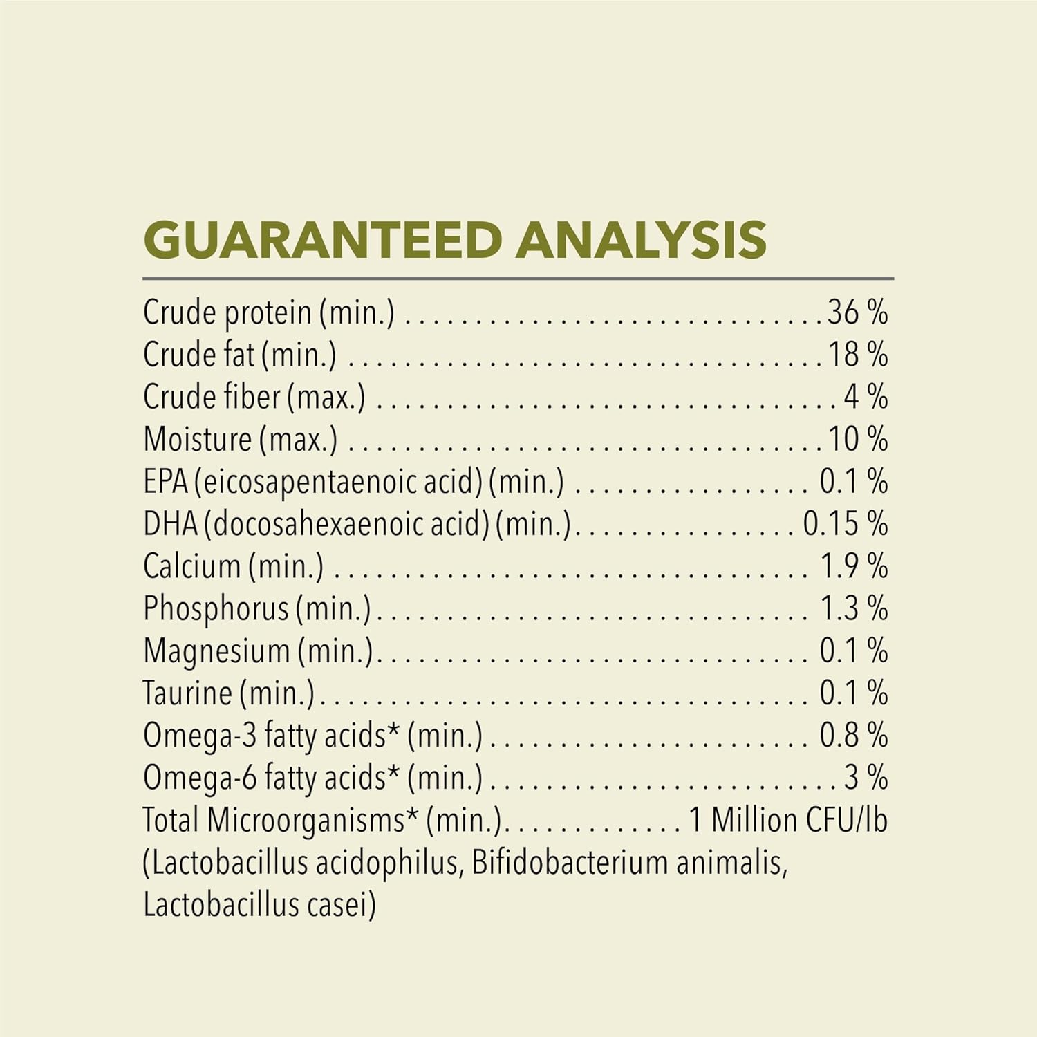 Duck, chicken, eggs, chicken meal, turkey meal, catfish meal, whole red lentils, whole pinto beans, chicken fat, turkey, whole green lentils, whole chickpeas, pea starch, chicken liver, quail, fish oil, duck meal, lentil fiber, chicken hearts, natural chicken flavor, duck liver, freeze-dried turkey, choline chloride,whole cranberries,whole pumpkin, collard greens, whole pears, whole apples, dried kelp, zinc proteinate, vitamin E supplement, mixed tocopherols (preservative), taurine, vitamin D3 supplement, vitamin A acetate, niacin, thiamine mononitrate, riboflavin, calcium pantothenate, pyridoxine hydrochloride, folic acid, vitamin B12 supplement, biotin, copper proteinate, DL-methionine, ascorbic acid (vitamin C), dried chicory root, turmeric, sarsaparilla root, althea root, rosehips, juniper berries, citric acid (preservative), rosemary extract, dried Lactobacillus acidophilus fermentation product, dried Bifidobacterium animalis fermentation product, dried Lactobacillus casei fermentation product