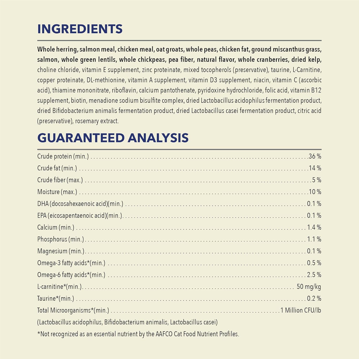 Whole herring, salmon meal, chicken meal, oat groats, whole peas, chicken fat, ground miscanthus grass, salmon, whole green lentils, whole chickpeas, pea fiber, natural flavor, whole cranberries, dried kelp, choline chloride, vitamin E supplement, zinc proteinate, mixed tocopherols (preservative), taurine, L-Carnitine, copper proteinate, DL-methionine, vitamin A supplement, vitamin D3 supplement, niacin, vitamin C (ascorbic acid), thiamine mononitrate, riboflavin, calcium pantothenate, pyridoxine hydrochloride, folic acid, vitamin B12 supplement, biotin, menadione sodium bisulfite complex, dried Lactobacillus acidophilus fermentation product, dried Bifidobacterium animalis fermentation product, dried Lactobacillus casei fermentation product, citric acid (preservative), rosemary extract.