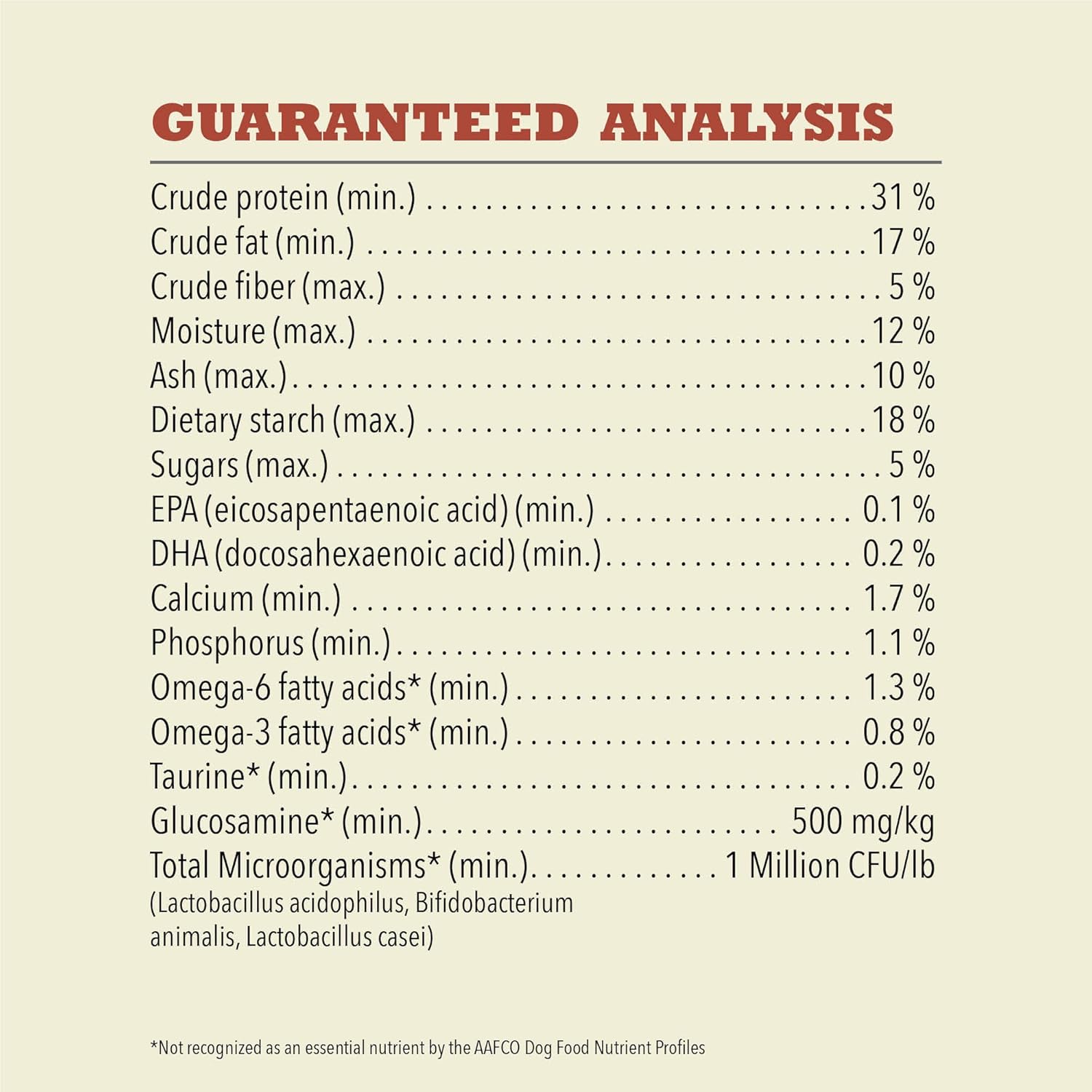 Beef, beef meal, beef liver, sweet potato, whole chickpeas, beef fat, whole lentils, whole pumpkin, fish oil, lentil fiber, natural flavor, beef tripe, whole cranberries, salt, choline chloride, taurine, dried kelp, vitamin E supplement, zinc proteinate, mixed tocopherols (preservative), vitamin D3 supplement, niacin, thiamine mononitrate, calcium pantothenate, pyridoxine hydrochloride, riboflavin, folic acid, vitamin B12 supplement, copper proteinate, freeze-dried beef, dried chicory root, turmeric, citric acid (preservative), rosemary extract, dried Lactobacillus acidophilus fermentation product, dried Bifidobacterium animalis fermentation product, dried Lactobacillus casei fermentation product.