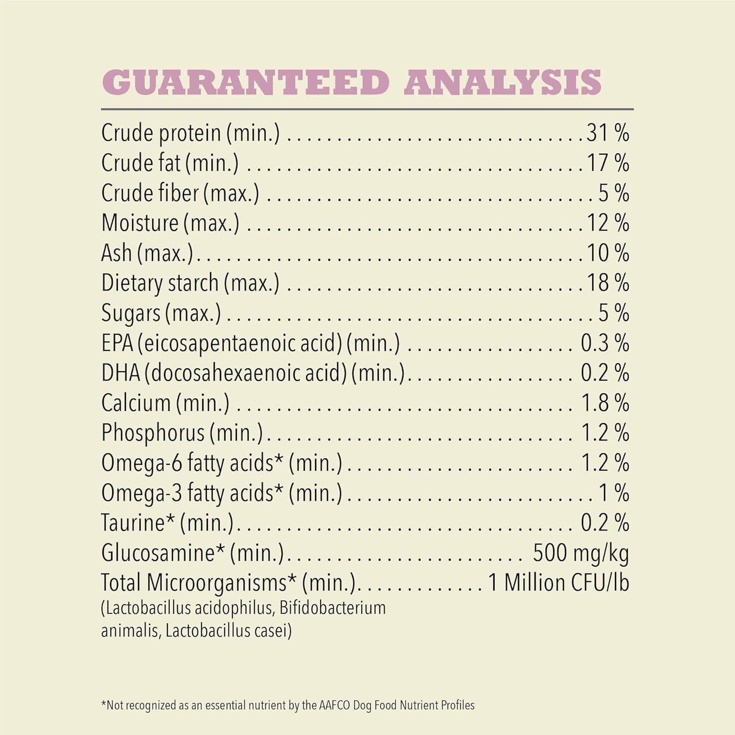 Lamb, lamb meal, lamb liver, sweet potato, whole chickpeas, fish oil, whole lentils, lentil fiber, whole apples, sunflower oil, natural lamb flavor, lamb tripe, whole pumpkin, whole cranberries, salt, choline chloride, taurine, dried kelp, zinc proteinate, vitamin E supplement, mixed tocopherols (preservative), selenium yeast, niacin, thiamine mononitrate, calcium pantothenate, pyridoxine hydrochloride, riboflavin, folic acid, vitamin B12 supplement, copper proteinate, freeze-dried lamb, dried chicory root, turmeric, citric acid (preservative), rosemary extract, dried Lactobacillus acidophilus fermentation product, dried Bifidobacterium animalis fermentation product, dried Lactobacillus casei fermentation product.