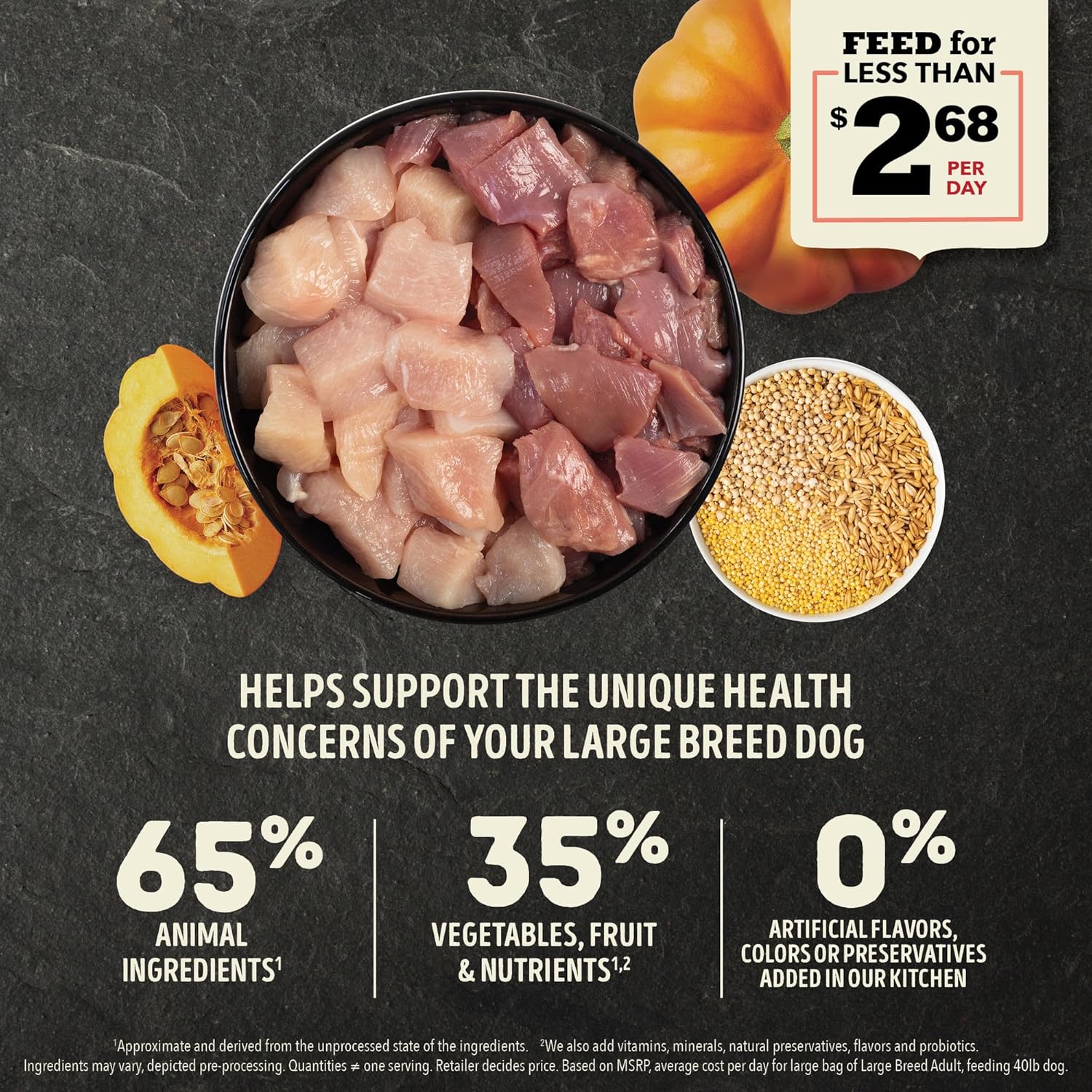 - High protein dog food recipe features free run* chicken and free run* turkey and is balanced to include 65 percent** animal ingredients and 35 percent*** wholesome grains, fruit, vegetables and nutrients