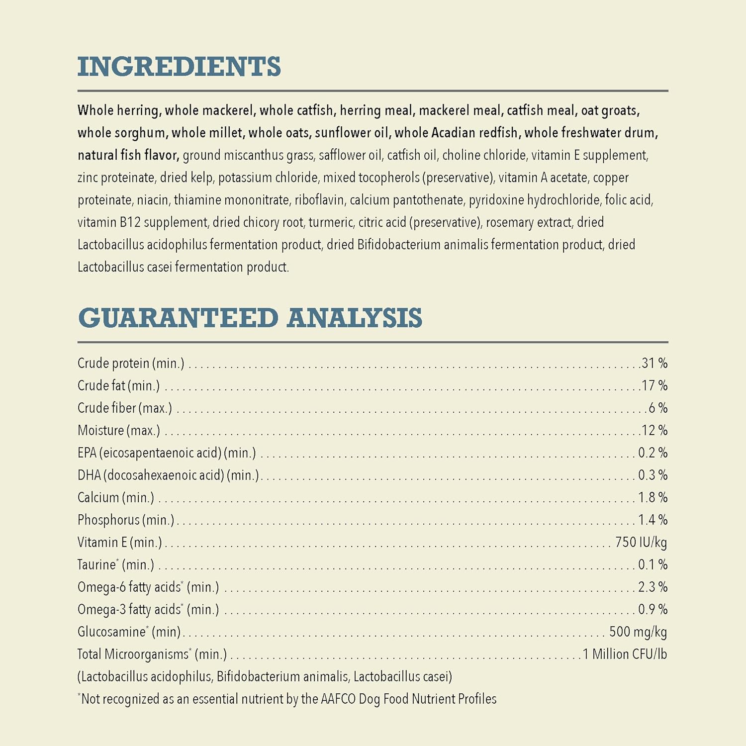 Whole Atlantic herring, whole mackerel, whole catfish, herring meal, mackerel meal, catfish meal, oatmeal, whole sorghum, whole millet, whole oats, sunflower oil, whole Acadian redfish, whole perch, Natural fish flavor, ground miscanthus grass, safflower oil, catfish oil, choline chloride, vitamin E supplement, zinc proteinate, dried kelp, mixed tocopherols (preservative), freeze-dried cod liver, copper proteinate, niacin, thiamine mononitrate, riboflavin, calcium pantothenate, pyridoxine hydrochloride, folic acid, vitamin B12 supplement, chicory root, turmeric, citric acid (preservative), rosemary extract, dried lactobacillus acidophilus fermentation product, dried bifidobacterium animalis fermentation product, dried lactobacillus casei fermentation product.