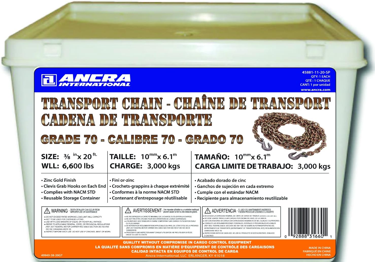 Ensure secure load tie-downs with the Ancra Cargo® 3/8" x 20' Grade 70 Chain, featuring durable heat-treated clevis hooks and a convenient storage pail for easy organization. Made from carbon alloy steel with a corrosion-resistant zinc-plated gold chromate finish, this chain combines strength and durability for demanding cargo securing needs.