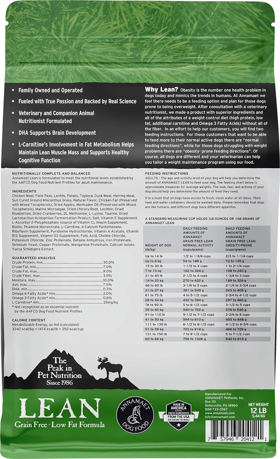 Annamaet Grain-Free Lean Reduced Fat Formula Dry Dog Food, (Chicken & Duck), 12-lb Bag
