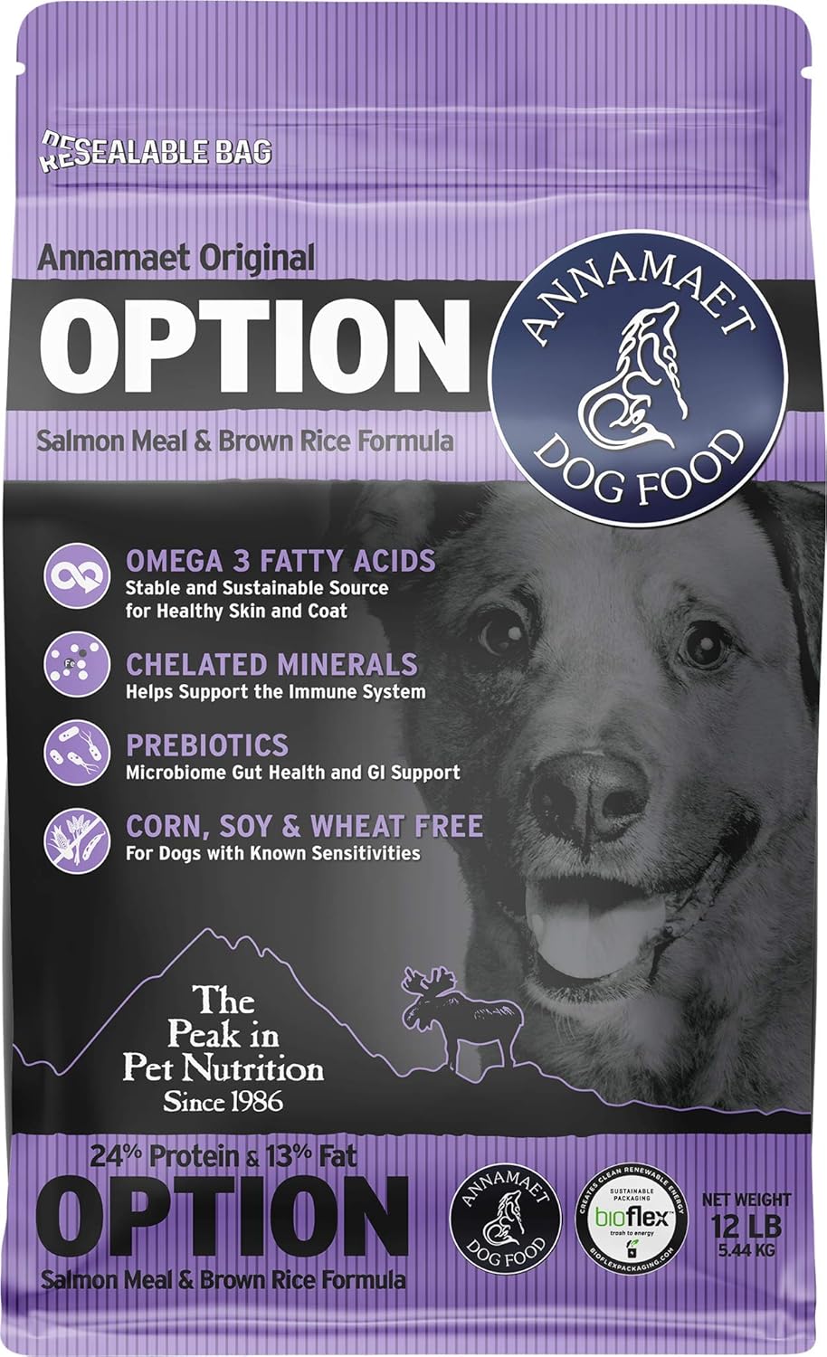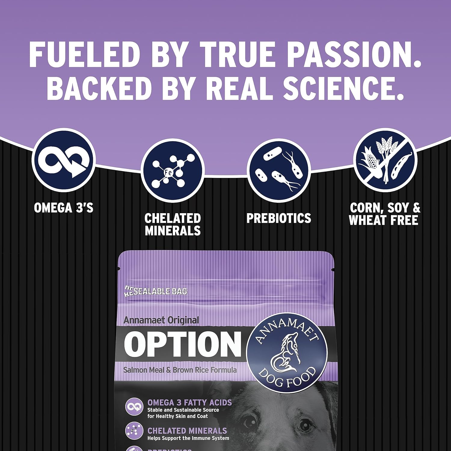 - An “option” to our chicken based products, this formula is made with salmon and free range, grass fed lamb, Annamaet Option is one of our most popular formulas, working very well for a variety of issues including many food allergies