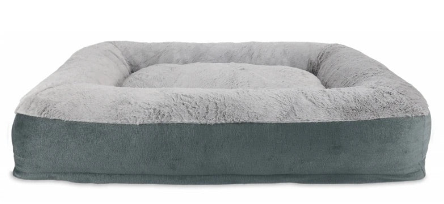 Textured micro suede wall and back print sherpa plush cushion * Rectangle shape, ideal for dogs who curl up as well as lay flat * Tailored walls to retain bed shape * Accent piping along edge * Non skid bottom * Removable stuffers for easy washing * Memory foam filled - foam made in USA, free of harmful BPAs and mercury * Zipper protected by fabric cover * Suitable for pets up to 120 lbs