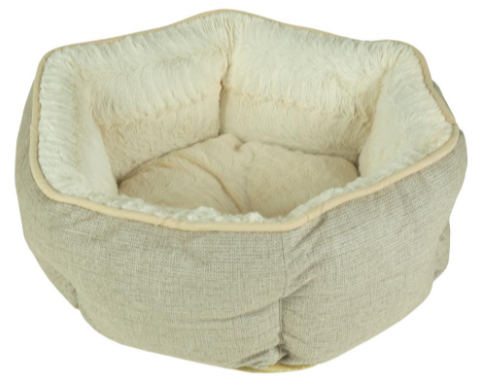 Textured non solid walls. Cut fur inside wall and cushion. Suede accent welt. Hexagon round shape, ideal for dogs who curl up. Machine washable in any size machine. Accent piping along edge. Non skid bottom. Durable, long wearing fabrics. Polyester fiber filled. Suitable for pets up to 30 lbs.