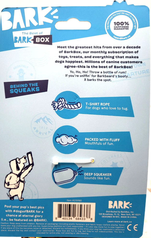 This bottle of rum dog toy is a pirate pups dream.There's no shame in our pups pirate games. This toy has an extra large squeaker and is filled to the cork with fluff so your dog can play happy pirate all day. Easy on the rum captain K9 Arrgh!