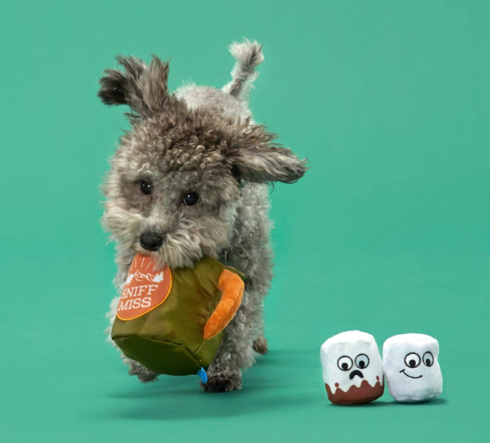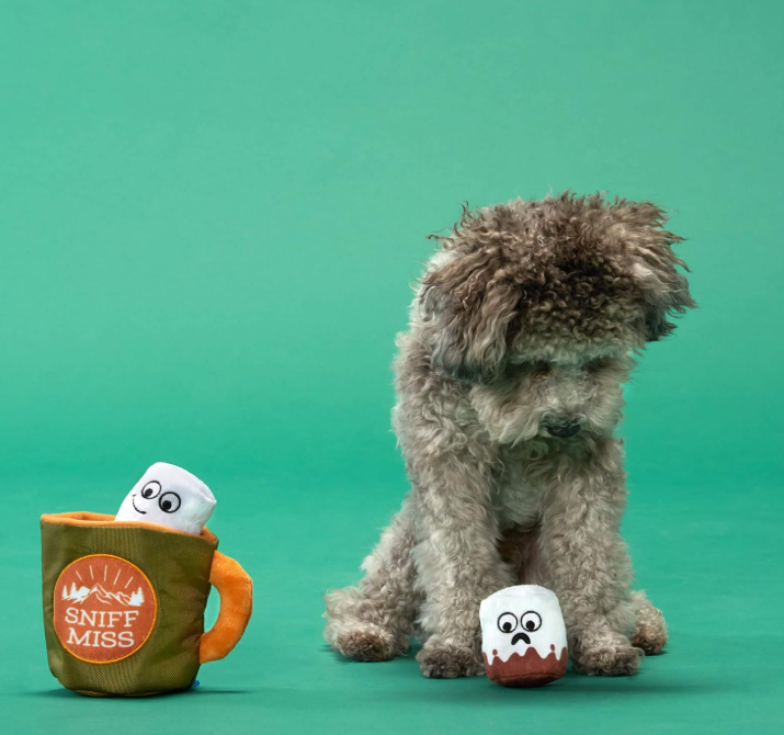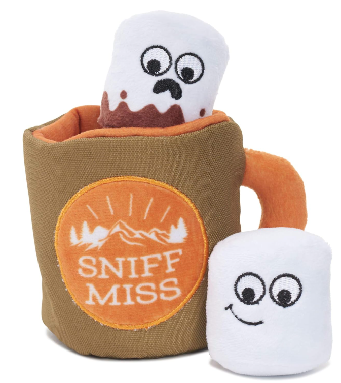 this three-in-one hot cocoa toy is a real squeak treat. Chew the squeaky marshmallows! Grip the tuggable handle! Or just nip this toy in the mug while you snuggle 'round the camp-fur. You can also hide treats inside the Sniff Miss mug for a tastier way to play.