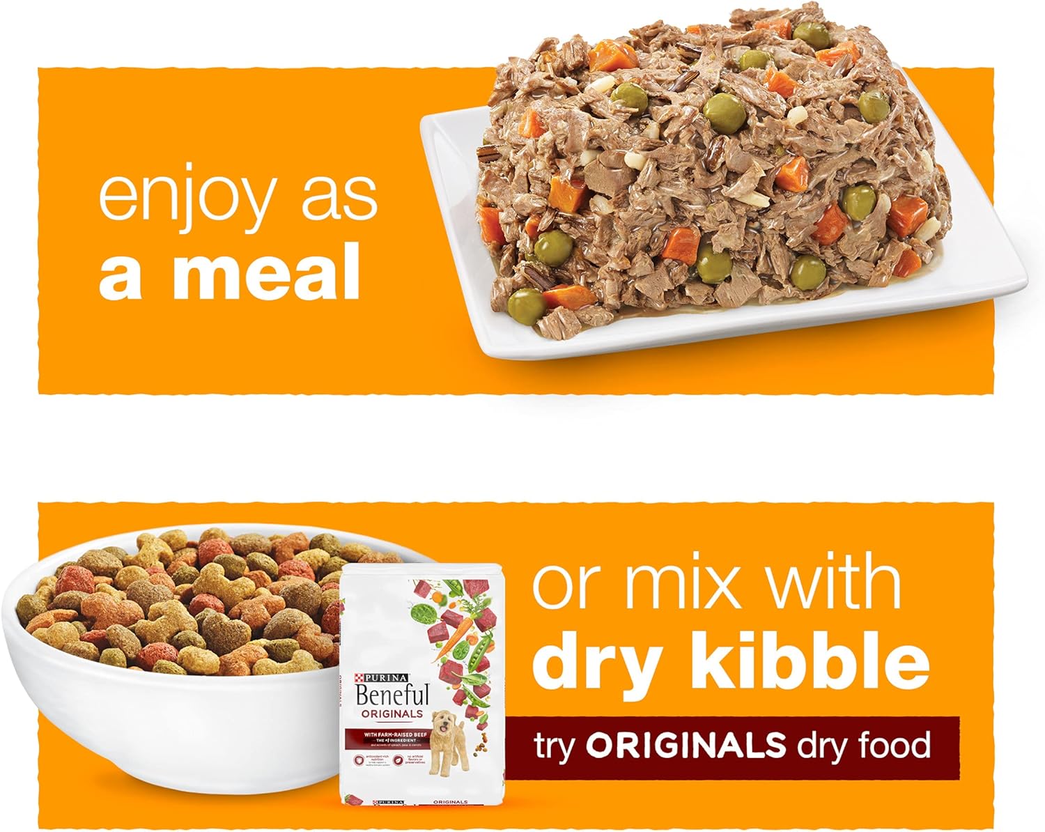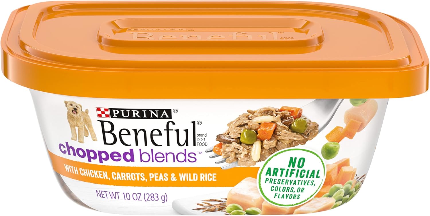 - Meaty shreds in a delicate touch of sauce for scrumptious flavor and easy chewing.Eight (8) 10 oz. Tubs - Purina Beneful Chopped Blends with Chicken, Carrots, Peas & Wild Rice.Real chicken provides high-quality protein.Made with real carrots, peas and wild rice for wholesome goodness you can see.Finely chopped meaty shreds in a touch of sauce for scrumptious flavor and easy chewing.23 essential vitamins and minerals help support his overall health.Proudly produced in Purina-owned U.S. facilities