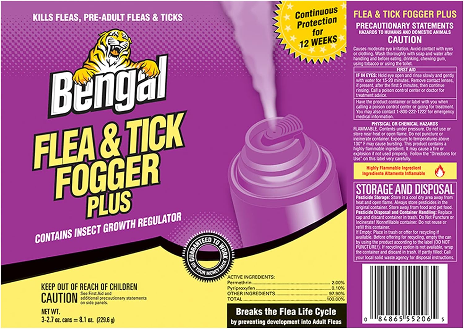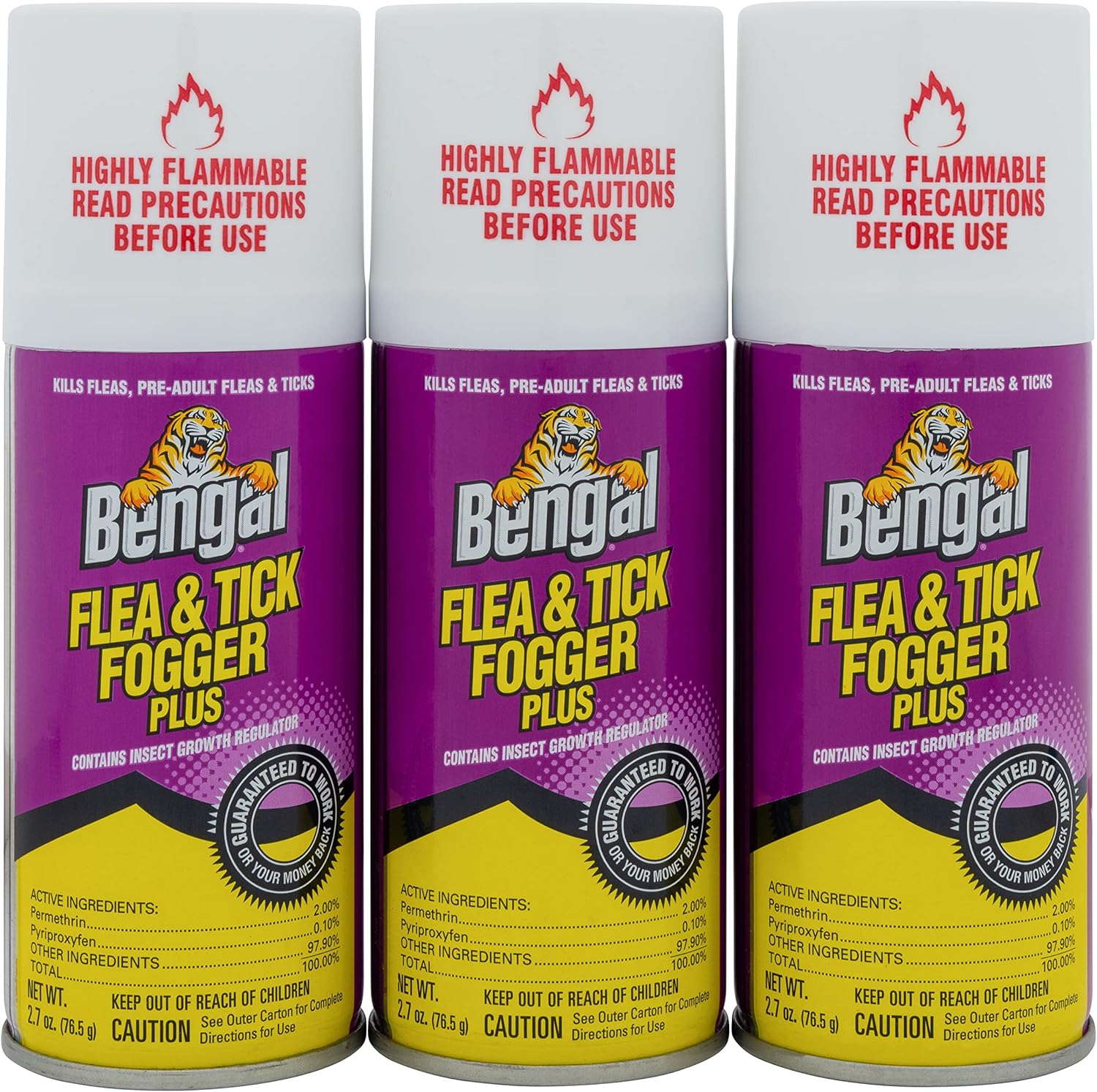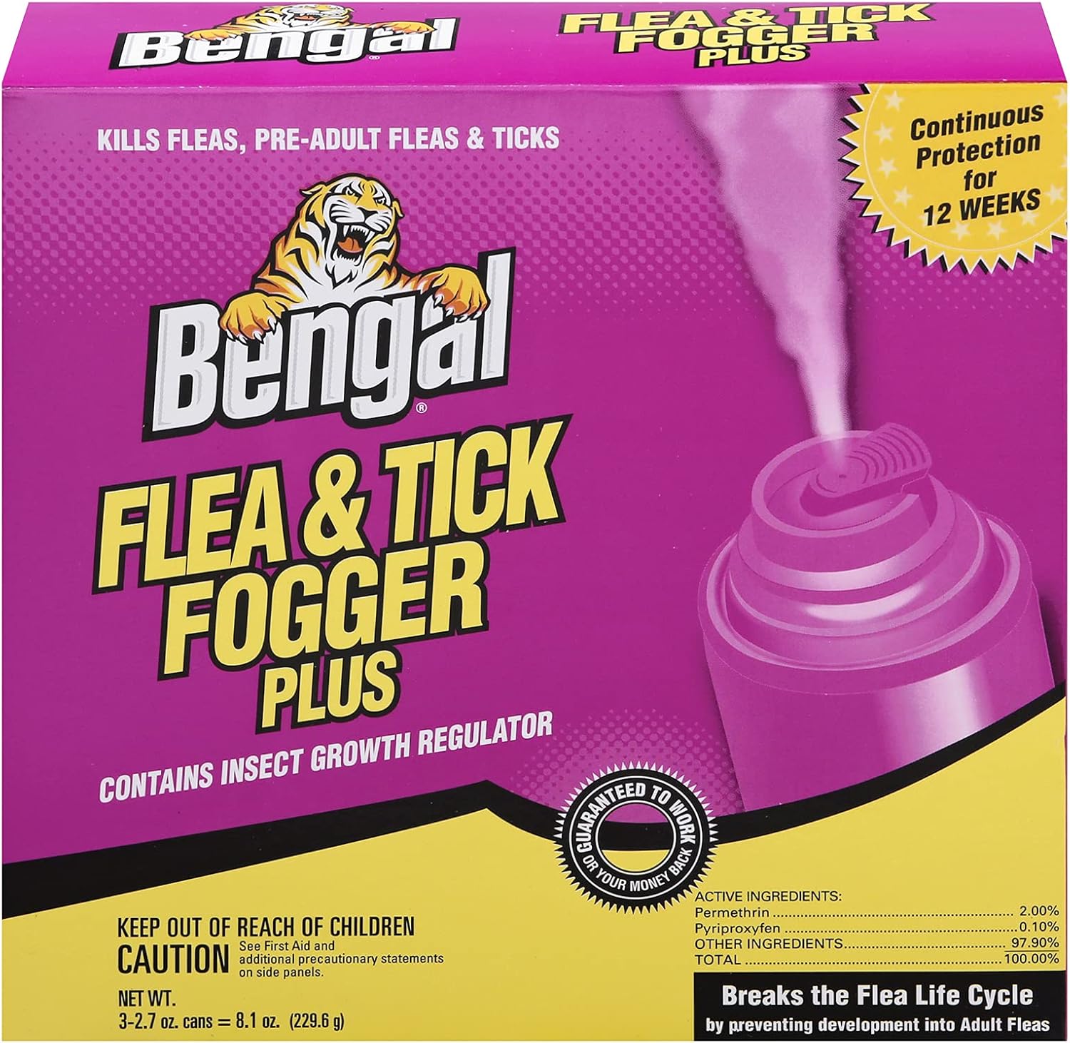 Eliminate fleas, ticks, and household pests quickly and effectively with Bengal® Flea & Tick Fogger. Specially formulated for heavy flea infestations, this powerful fogger contains an Insect Growth Regulator (IGR) to target adult and pre-adult fleas and ticks, providing up to 12 weeks of protection.