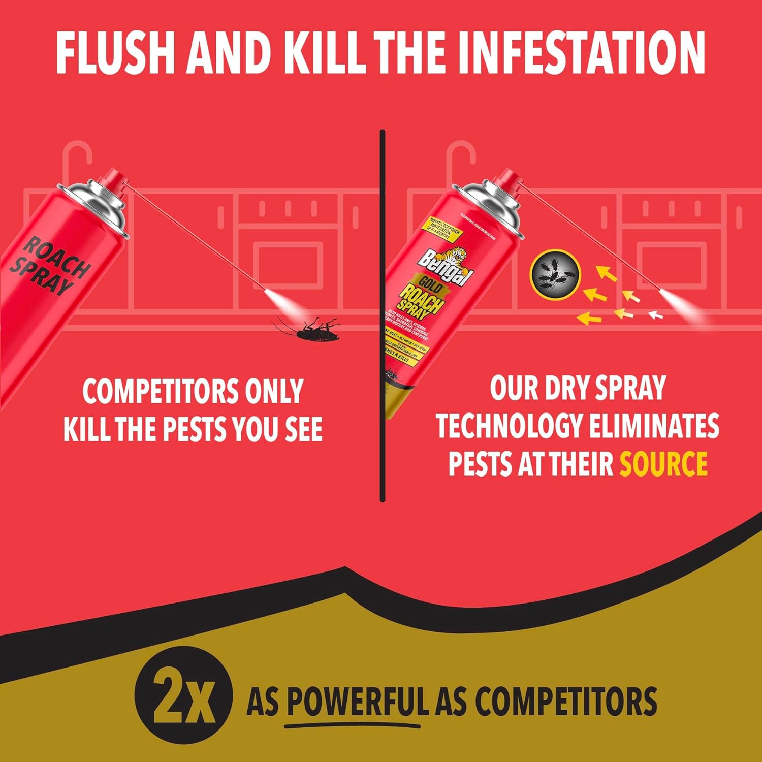 Designed to flush and kill roaches, ants, spiders, mosquitoes, centipedes, crickets, silverfish, and other insects, the dry spray formula carries the killing ingredient deep into cracks, crevices, and hard-to-reach areas. With no mess, no odor, and no stains, Bengal® Gold Roach Spray offers professional-strength results without the harsh solvents or water-heavy formulas found in other sprays.
