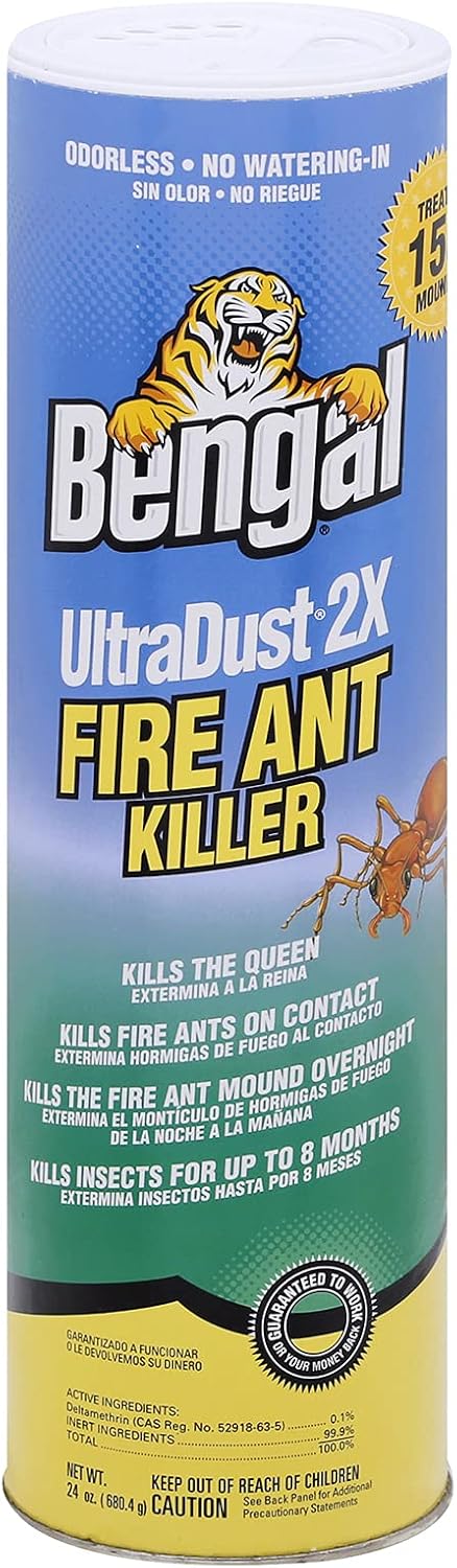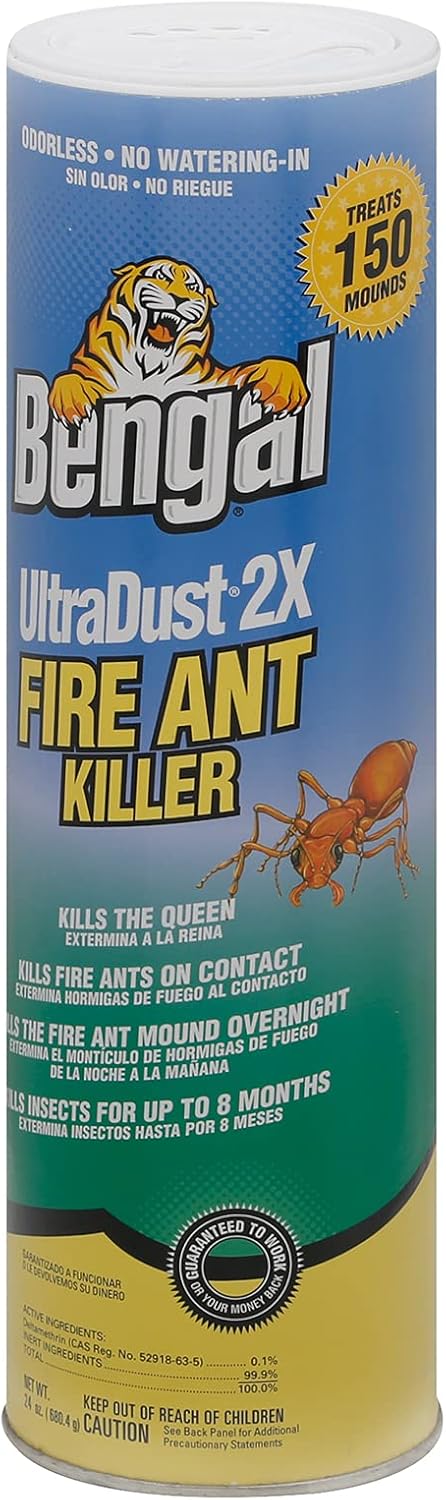 Eliminate fire ants quickly and effectively with Bengal® Ultradust 2X Fire Ant Killer. This premium odorless, dry insecticide works on contact to kill fire ants, including the queen, and keeps colonies under control for up to 8 months. Unlike ant bait products, it acts immediately as ants come into contact with the dust and spreads naturally through the colony for overnight elimination.