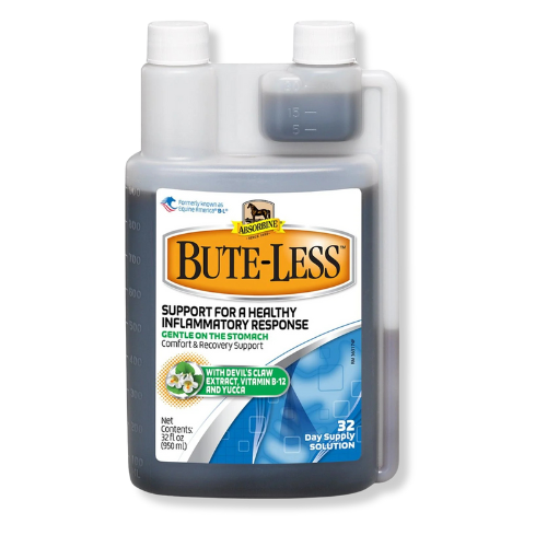Relief for horses that’s gentle on the stomach. A proven alternative in relief for horses with discomfort, Bute-Less® uses natural ingredients such as Devil’s Claw, vitamin B-12, and yucca to help ease aches and discomfort associated with normal daily exercise and activity, training, or competition. 32oz / 32 Day and Gallon 128 Day sizes.