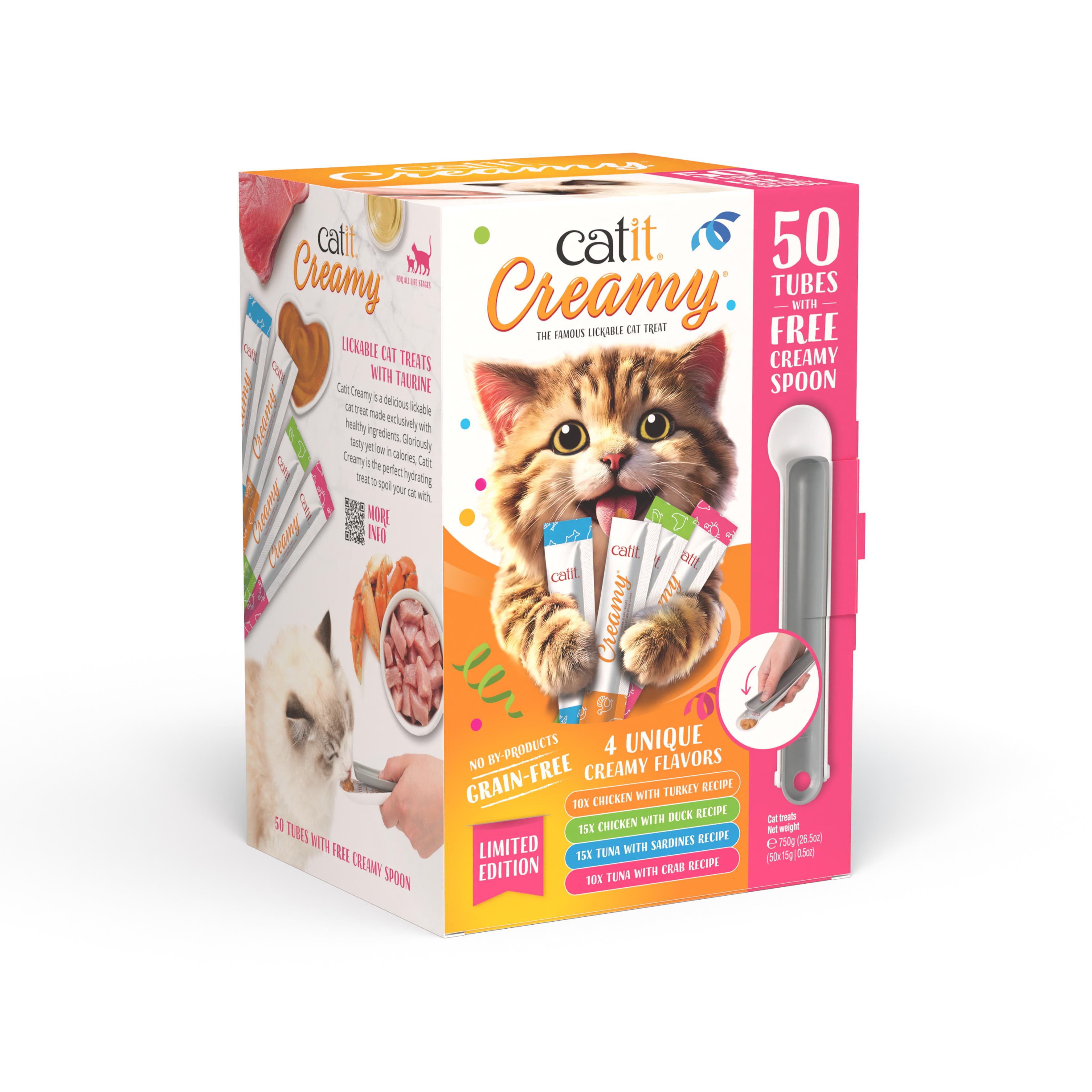 Catit Creamy is a nutritious and hydrating snack that adds variety to your cat’s diet. It is essential to keep your cat hydrated, as it ensures proper kidney function and digestion. Hydrating cat treats in 4 unique delicious flavors: Chicken with Turkey, Chicken with Duck, Tuna with Sardines, Tuna with Crab Fresh all-natural ingredients, with essential nutrients High in protein, rich in amino acids Contains 50 tubes of Catit Creamy Delicious by itself or as dry food topping Mix box contains 10x Chicken with Turkey, 15x Chicken with Duck, 15x Tuna with Sardines, 10x Tuna with Crab Also available in packs of 5 and packs of 12 Includes 1 Catit Creamy Spoon The Catit Creamy Spoon allows you to easily feed your cat its Catit Creamy snacks without spilling them. Open the tube of Catit Creamy, place it inside the spoon and gently press the flap to squeeze out every last drop of Creamy. The Creamy Spoon is made of soft BPA-free plastic and is dishwasher safe for easy cleaning.