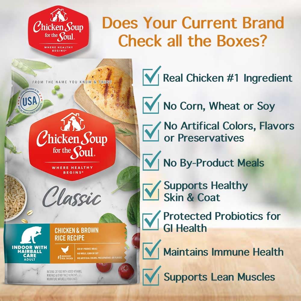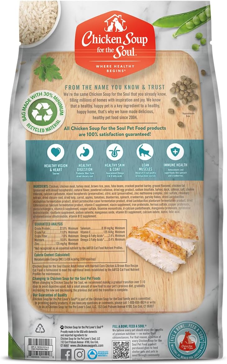 Chicken Soup for The Soul All Natural Premium Indoor w/Hairball Care Adult Dry Cat Food, Real Meat First Ingredient, No by-Products, Supports Intestinal Health, Chicken & Brown Rice