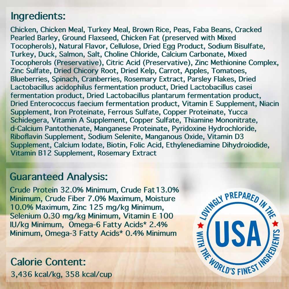 Ingredients Chicken, chicken meal, turkey meal, brown rice, peas, faba beans, cracked pearled barley, ground flaxseed, chicken...