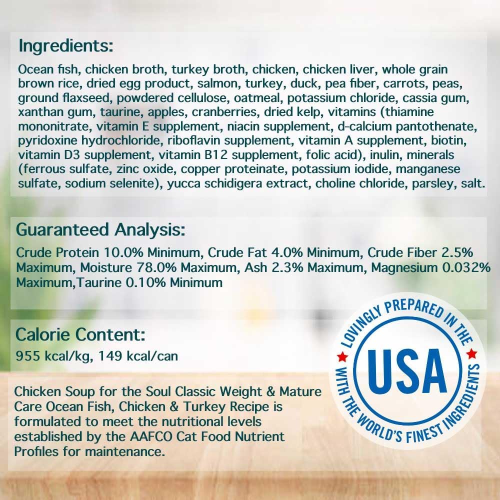 - MADE WITH REAL INGREDIENTS: Each 5.5 ounce can Of our Weight & Mature cat food is made with real ingredients like ocean fish, chicken, salmon and duck, real veggies and fruit