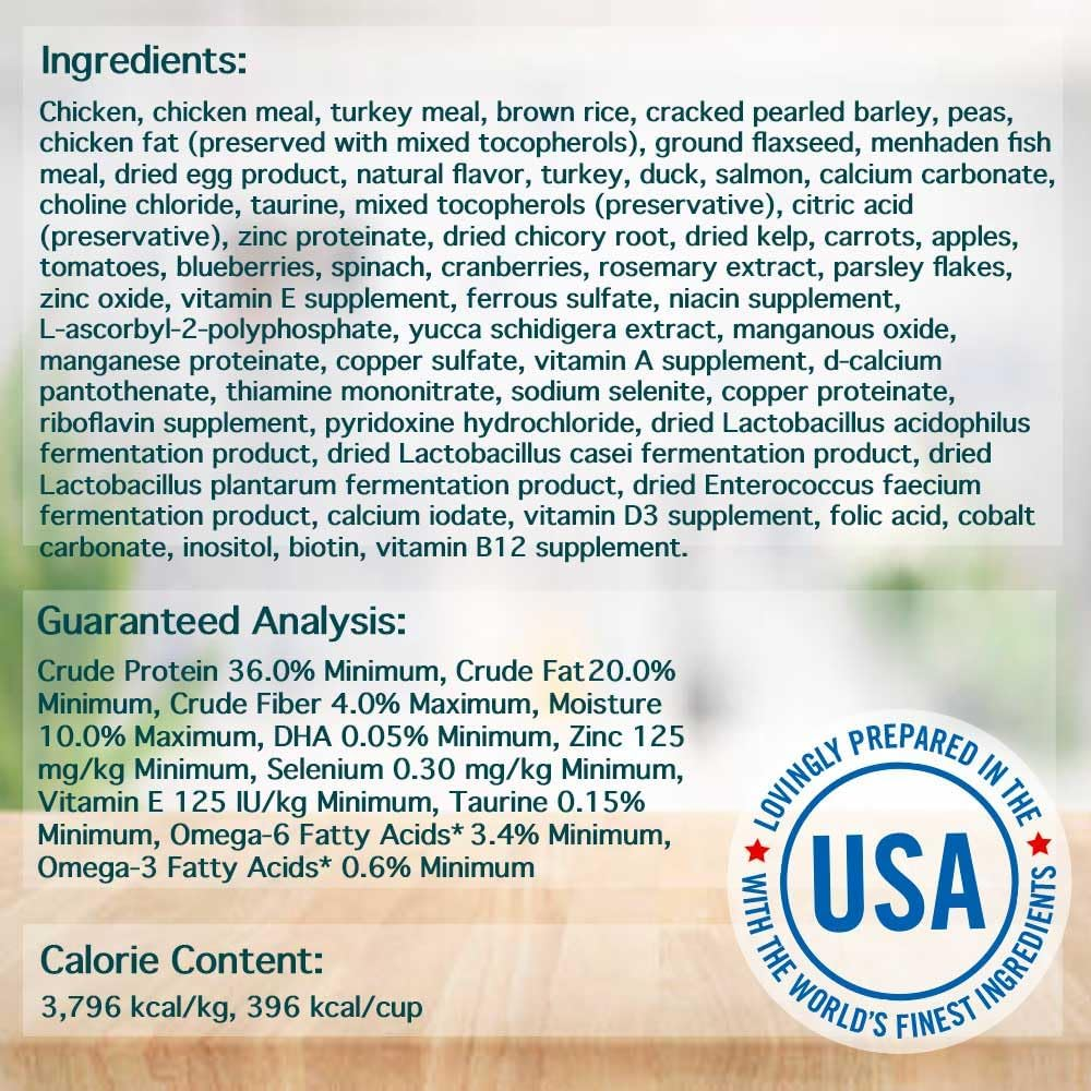 Ingredients Chicken, chicken meal, turkey meal, brown rice, cracked pearled barley, peas, chicken fat (preserved with mixed...