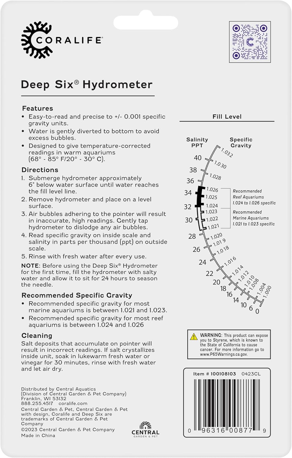 Coralife Aquarium Fish Tank Deep Six Hydrometer For Measuring Water Salinity PPT and Specific Gravity