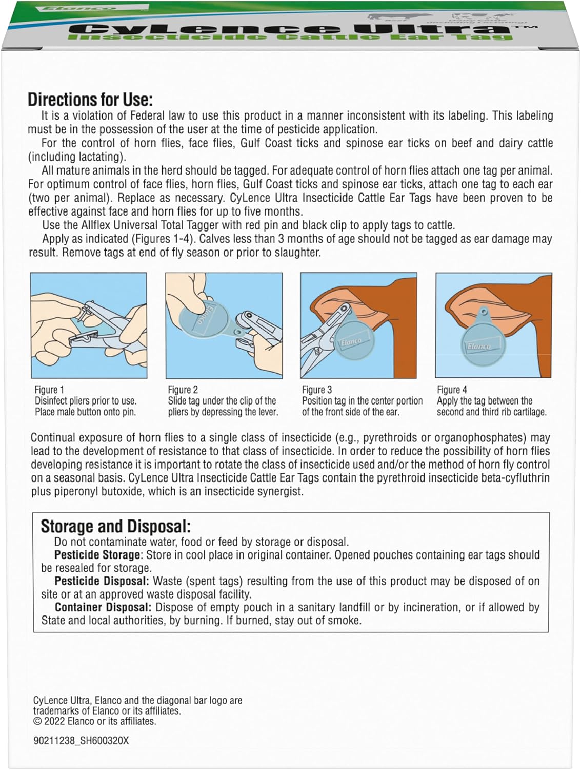 Designed for use on all mature beef and dairy cattle, including calves aged three months and older, CyLence Ultra® ear tags offer up to five months of effective protection. They are compatible with the Allflex® Universal Total Tagger for easy and secure application.