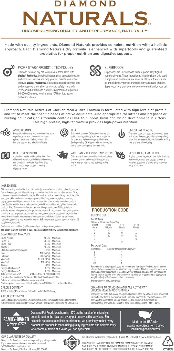 Diamond Naturals Active Cat Chicken Meal & Rice Formula is formulated with high levels of protein and fat to meet the specific needs of active adult cats. Also appropriate for kittens and pregnant or nursing adult cats, this formula contains DHA to support brain and vision development in kittens. This high-protein, high-fat formula provides high-power nutrition in every situation.