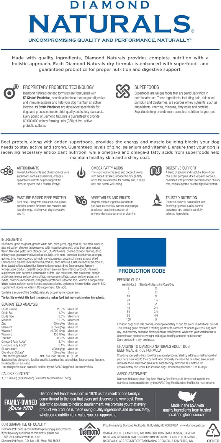 Diamond Naturals Dry Food for Adult Dog, Beef and Rice Formula, 40 Pound Bag (074198608331)