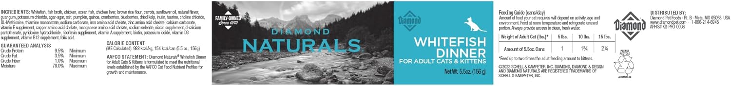 Whitefish, fish broth, chicken, ocean fish, chicken liver, brown rice flour, carrots, sunflower oil, natural flavor, guar gum, potassium chloride, agar-agar, salt, pumpkin, quinoa, cranberries, blueberries, dried kelp, inulin, taurine, choline chloride, DL-Methionine, thiamine mononitrate, sodium carbonate, iron amino acid chelate, zinc amino acid chelate, calcium carbonate, vitamin E supplement, copper amino acid chelate, manganese amino acid chelate, sodium selenite, niacin supplement, d-calcium pantothenate, pyridoxine hydrochloride, riboflavin supplement, vitamin A supplement, biotin, potassium iodide, vitamin D3 supplement, vitamin B12 supplement, folic acid.