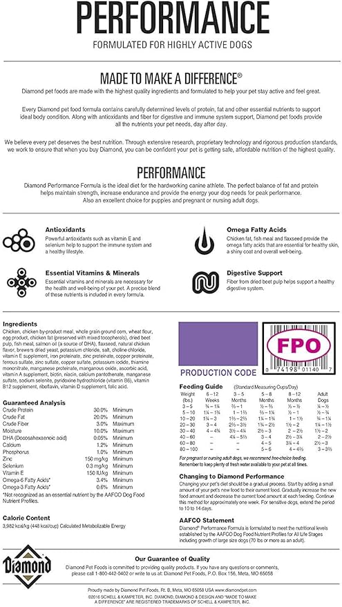 Diamond Performance Formula is the ideal diet for the hardworking canine athlete. Added glucosamine and chondroitin help support joints, while the perfect balance of fat and protein help maintain strength, increase endurance and provide the energy your dog needs for peak performance.