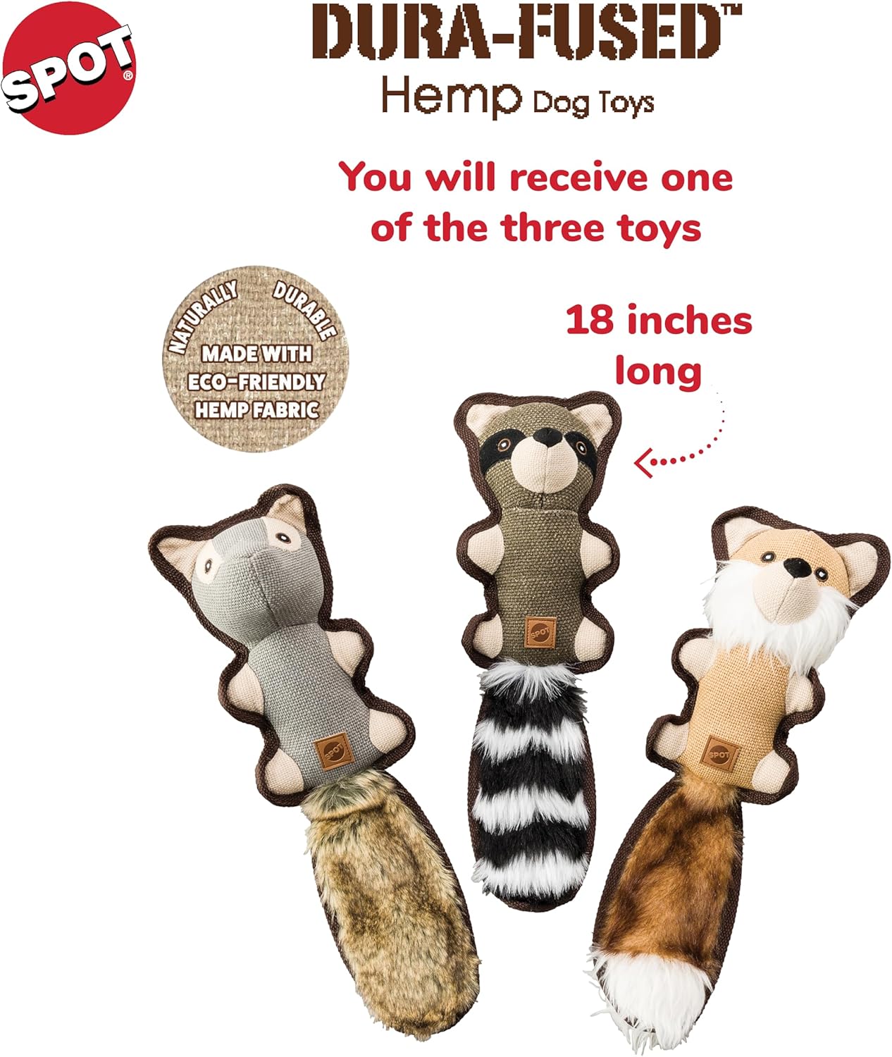 SPOT Dura-Fused Hemp Friends - Dog Toy Made with Hemp Material, Fused with Tricot for Durablity, with Furry Plush Tail and Squeaker, Great for Light to Moderate Chewers - 18" Assorted Styles